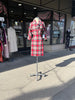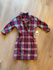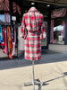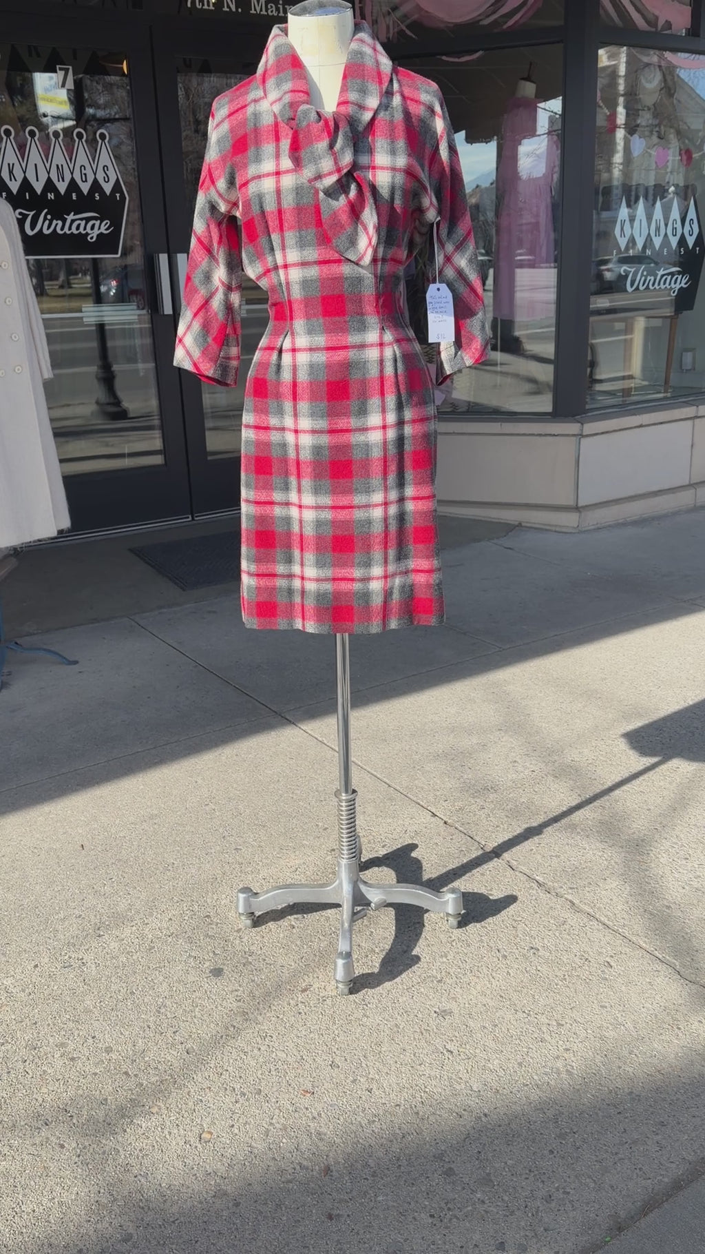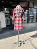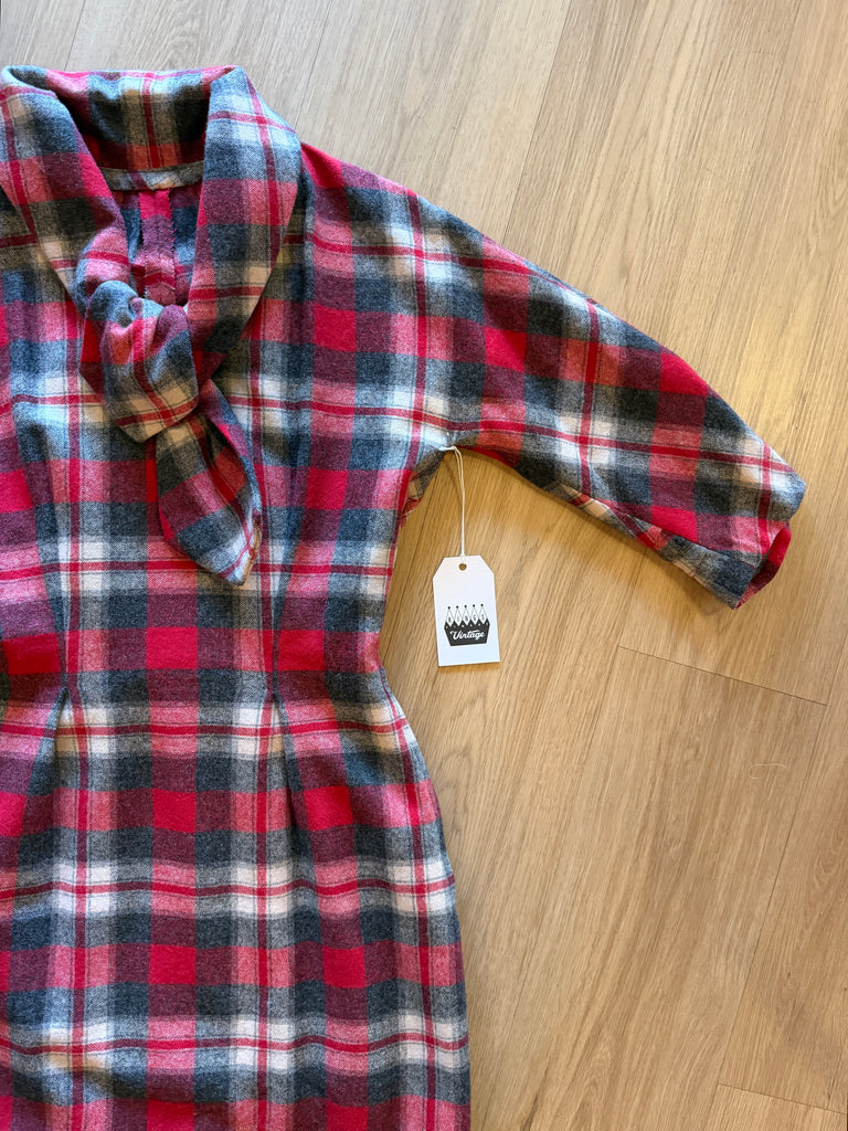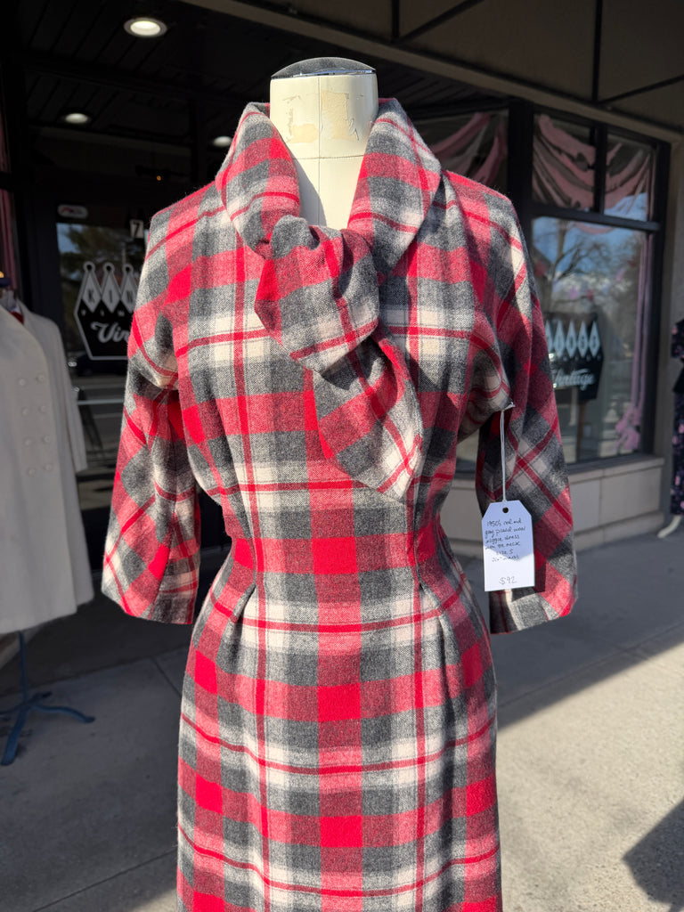 1950's bold plaid wiggle dress in high contrast red, grey, and cream. Made from a soft winter weight wool with an absolutely stunning design and classic silhouette. The neckline of this dress has a substantial collar that goes around the back then ties at the bottom front in a pretty shape. It has a 3/4 dolman sleeve and princess darts in front and back flatter a very hourglass shape. My favorite feature of this dress in in the back where starburst pleats come from the middle back creating a gorgeous blouson back accented with a pointed tab across the back waist that has red buttons on either side. A very polished 50s design. Closure is a red metal side zipper and skirt is fully lined for comfort and ease of movement.